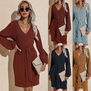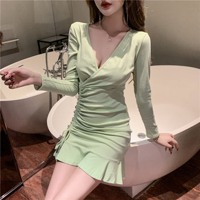 2022秋冬新款性感V领抽绳裙子长袖褶皱修身荷叶边...