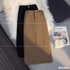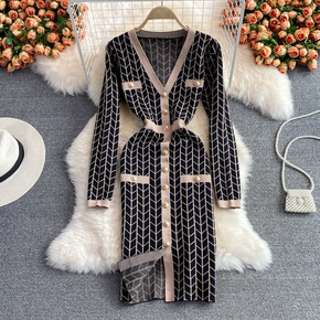 跨境2021秋冬新款韩版气质修身V领收腰开叉包臀时...