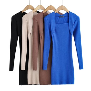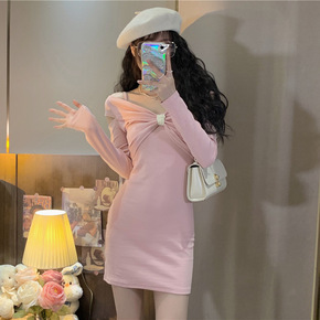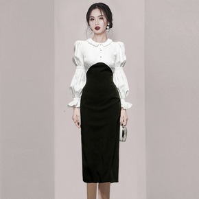 针织连衣裙女假两件黑色长袖包臀短裙秋冬2021年新...