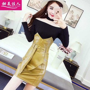 夜场女装套装时尚秋冬两件套女一字肩包臀皮裙性感气质...