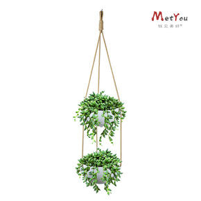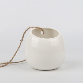 现代白色陶瓷尼龙绳麻绳悬挂连体圆形花盆室内装饰植物...