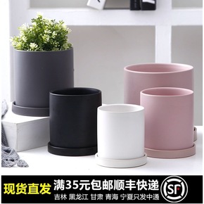 厂家直供陶瓷花盆带托盘ins北欧轻奢简约风格圆柱现...