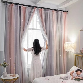 网红渐变镂空星星遮光窗帘少女卧室客厅双层窗帘成品批...
