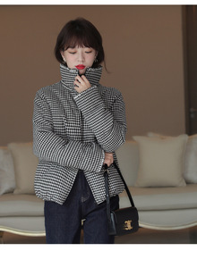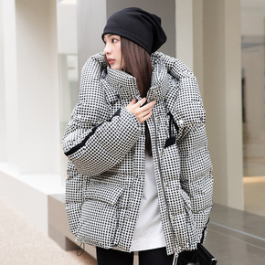 2021冬装新款短款小个子千鸟格加厚保暖韩版贴布羽...