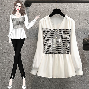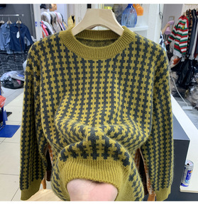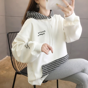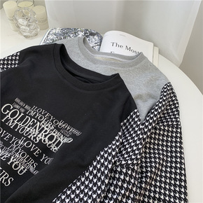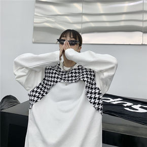 千鸟格拼接卫衣女圆领套头2021春款休闲撞色宽松大...