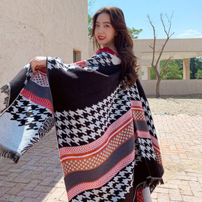 厂家直销千鸟格斗篷披肩女士 秋冬保暖双面格子开叉披...