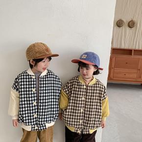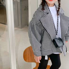 2022女童秋季新款千鸟格西装领拉链外套儿童泡泡袖...