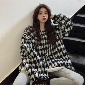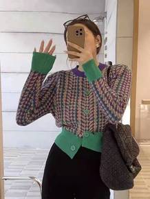 港风复古千鸟格开衫毛衣短款外套女新款时尚洋气百搭打...