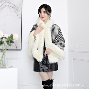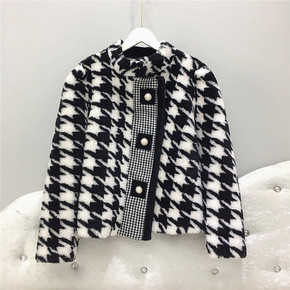 2021秋冬新款小香风黑白千鸟格立领颗粒羊毛皮草外...