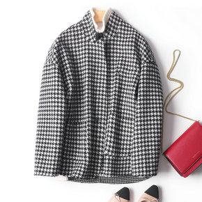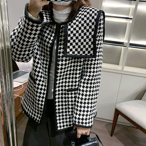 大码女装小香风千鸟格毛呢外套女海军领宽松小众别致上...