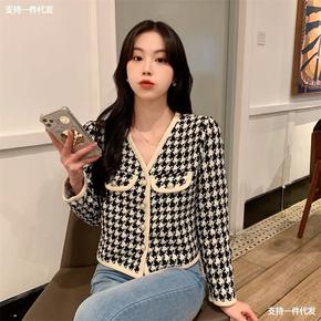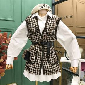 新款新款秋装新款收腰长袖衬衫+千鸟格小香风粗花呢坎...