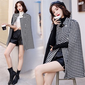 韩版毛呢斗篷大衣女2021年秋冬季新款千鸟格双排扣...