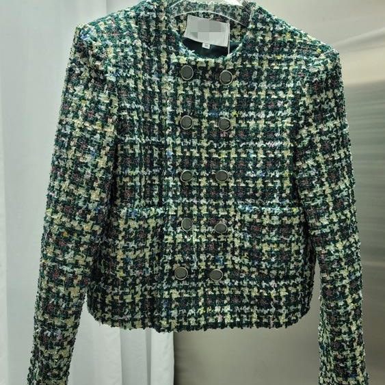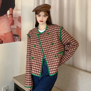 双面毛呢外套女千鸟格拼接撞色新款短款上衣小个子...