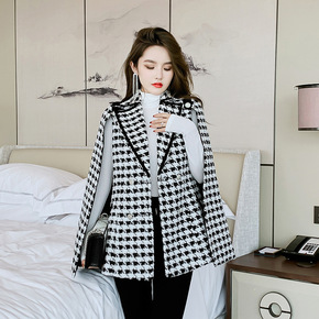 2021秋冬装新款时尚气质千鸟格斗篷西装领双排扣洋...