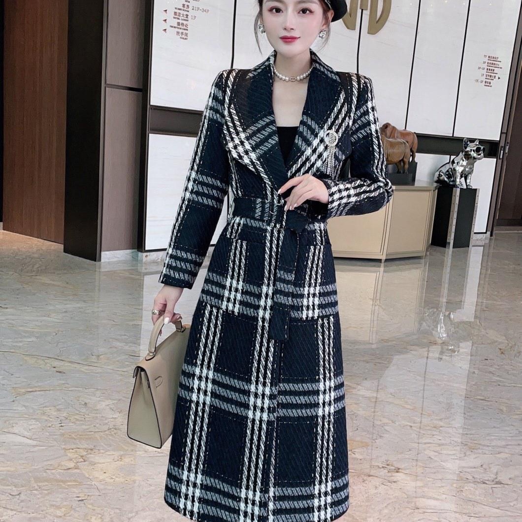 2021冬装新款时尚简约大气收腰系带千鸟格羊毛呢大...