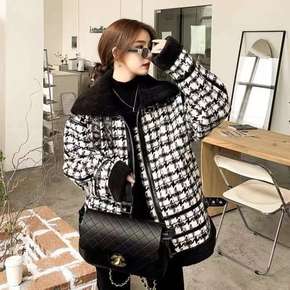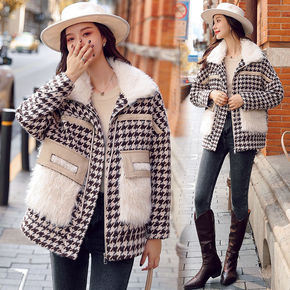 仿兔绒毛外套女加厚冬季2022新款加绒千鸟格机车棉...