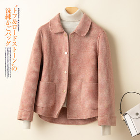秋冬双面绒大衣女小个子短款羊毛呢外套千鸟格娃娃领妈...