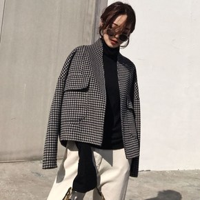 加厚毛呢大衣女短款2021新款秋冬小个子千鸟格西装...