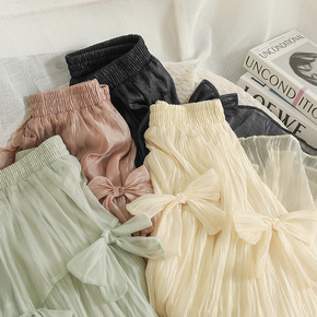 韩版蝴蝶结高腰中长款纯色纱裙女2022夏装松紧腰显...