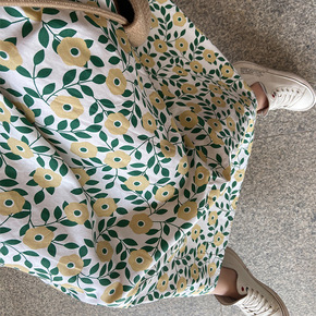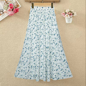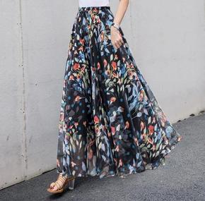 夏季A字气质通勤印花雪纺棉蓬松中长黑色短裙纯色裙子...