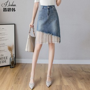 春夏2022新款牛仔半身裙网纱蕾丝拼接优雅修身显瘦...