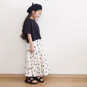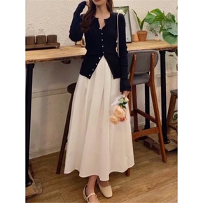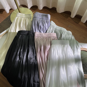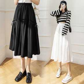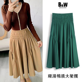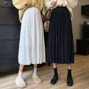 秋季百搭伞裙秋冬松紧腰长款半身裙纯色新款百褶裙黑白...