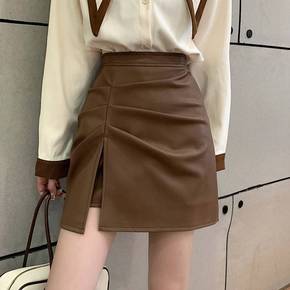 皮裙短裙大码女褶皱棕色包臀高腰A字半身裙不规则皮裙...
