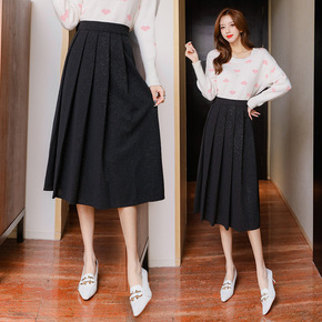 高腰显瘦百褶胖黑色半身裙女秋冬大码中长款休闲字裙毛...