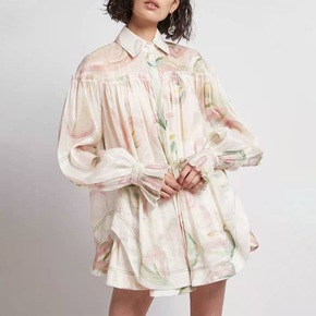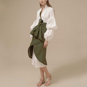 欧美2022春新款宽松V领泡泡袖中长款衬衫裙+不规...