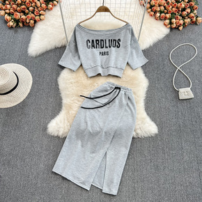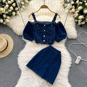 时尚套装女名媛气质一字肩露肩短款修身上衣两件套高腰...
