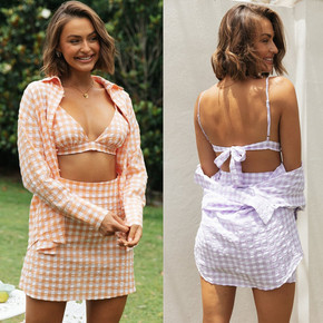 2022速卖通独立站新款女装时尚格子三件套衬衫背心...