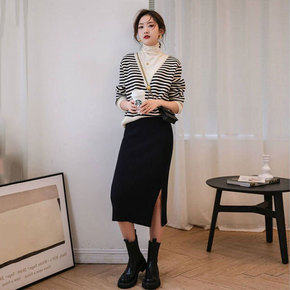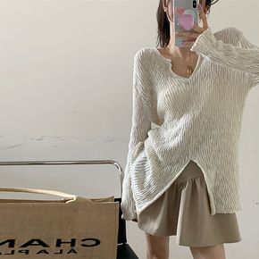RHGD实拍早秋2022新款韩风开叉领针织衫+高腰...