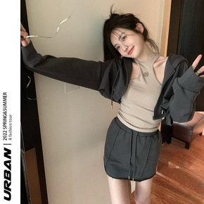 早秋卫衣女连帽短款上衣休闲套装露脐挂脖背心2022...