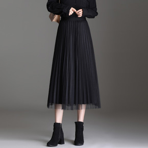 毛呢网纱两面穿半身裙女秋冬季2021新款A字百褶裙...
