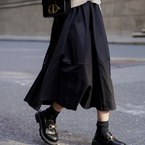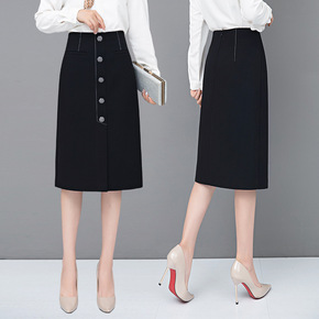 2022春装中裙百搭黑色气质雾霾蓝纯色拼接优雅显瘦...