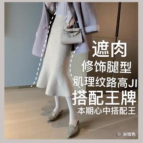 针织半身裙高腰中长款秋冬新款复古气质百搭菱格纹鱼尾...