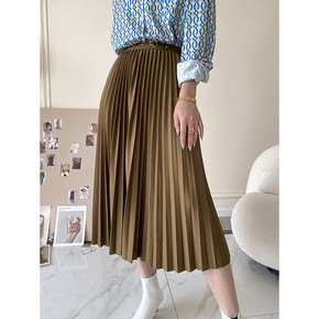 速卖通跨境高腰缎面金属色百褶半身裙春夏女复古中长款...