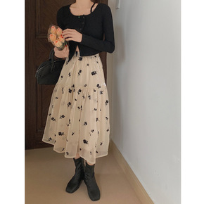 实拍 2022春季新款气质欧根纱复古玫瑰花印花中长...