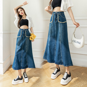 口袋毛边复古鱼尾裙牛仔半身裙女2022春夏高腰荷叶...