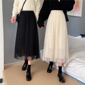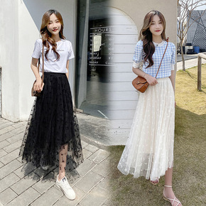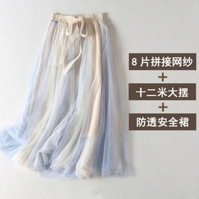 实拍2022春夏亮片拼接百褶网纱半身裙搭毛衣韩版大...