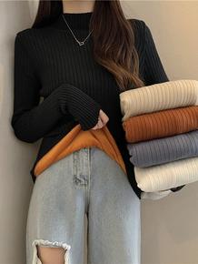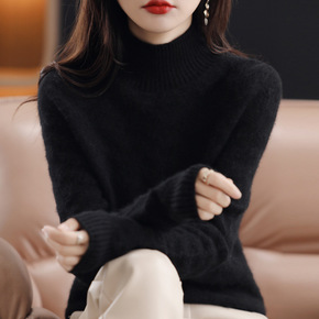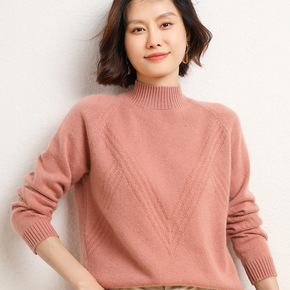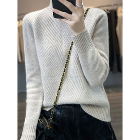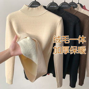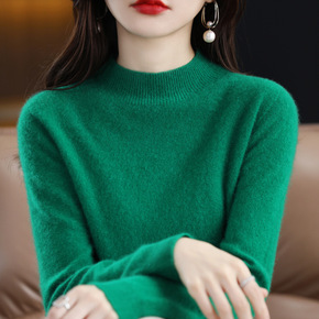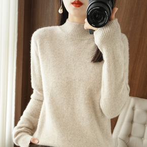 无缝一体半高领纯羊毛衫女士打底针织衫套头中领内搭毛...