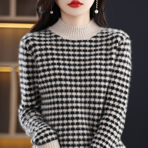 2022秋冬新款半高领千鸟格羊毛衫女时尚慵懒风针织...