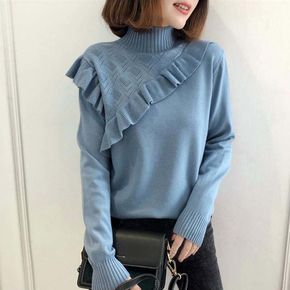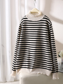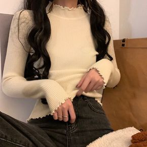 批发自制22秋冬女半高领蕾丝木耳边条纹针织保暖修身...