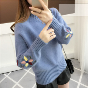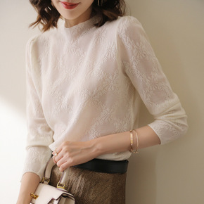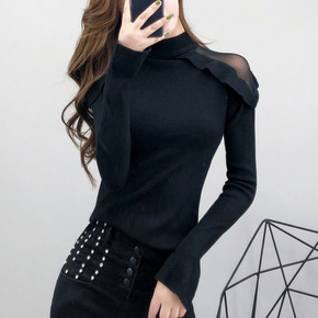 2020新款秋冬女装半高领欧根纱长袖毛衣女宽松镂空...