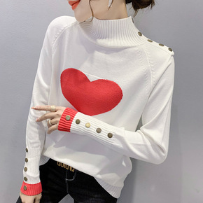 2022冬季新款宽松长袖半高领爱心针织衫女上衣洋气...