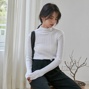 S-XXL~休闲半高领抽条女式羊毛衫纯色套头修身打...