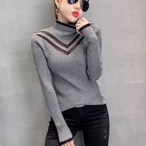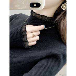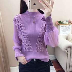 秋冬新款半高领蕾丝毛衣女装韩版百搭镂空长袖针织衫宽...