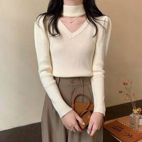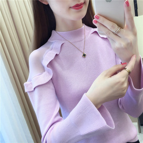 秋装2022款女半高领蕾丝针织衫性感露肩长袖打底衫...
