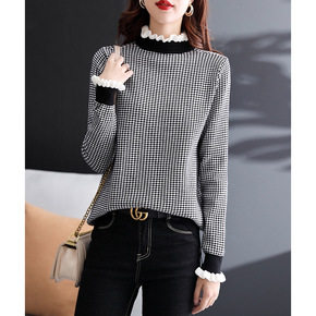 慵懒风宽松百搭千鸟格针织衫秋冬装韩版木耳边套头毛衣...