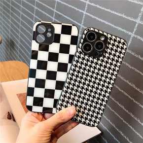 网红棋盘格黑白苹果12手机壳11玻璃13情侣X70...